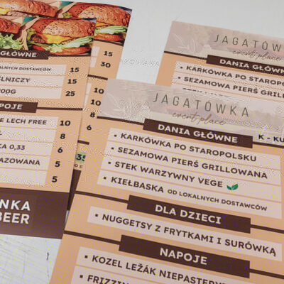 Menu restauracyjne są drukowane na papierze lub kartonie, z możliwością laminacji lub spiralowania. Mogą zawierać zdjęcia, opisy dań i ceny, stanowiąc skuteczne narzędzie promocji restauracji lub lokalu gastronomicznego.